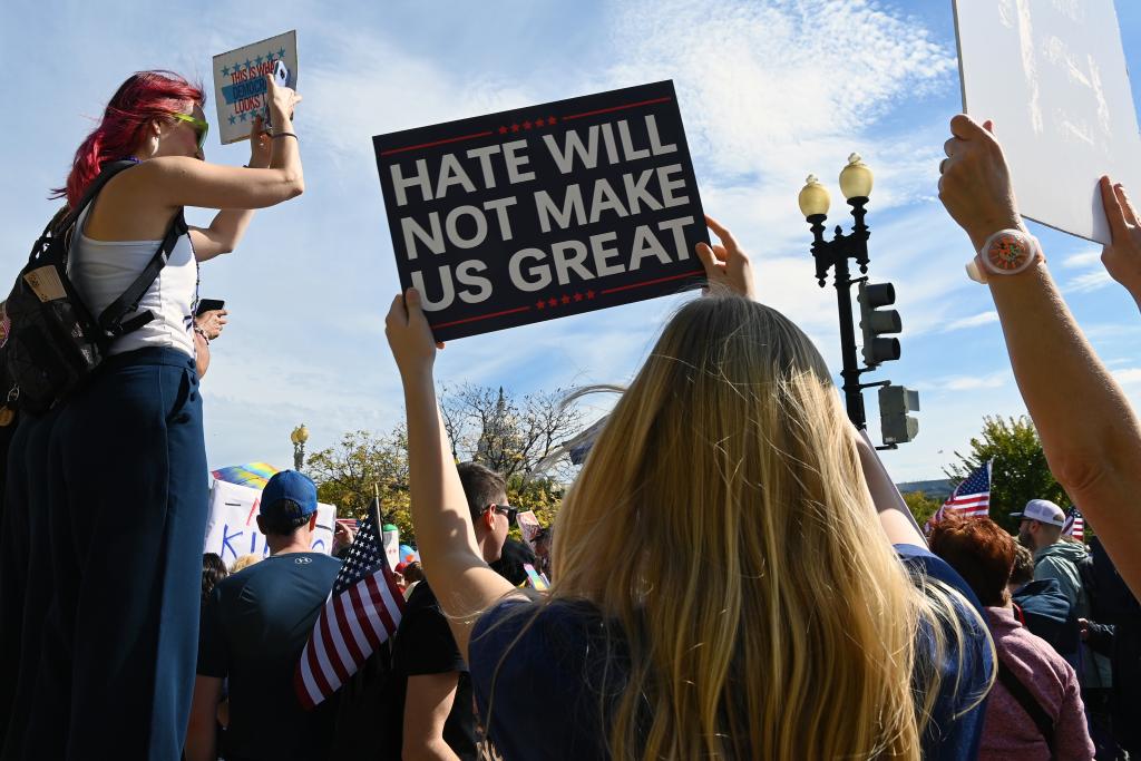 10月18日,在美國(guó)華盛頓,人們參加示威游行活動(dòng)。新華社記者李睿攝