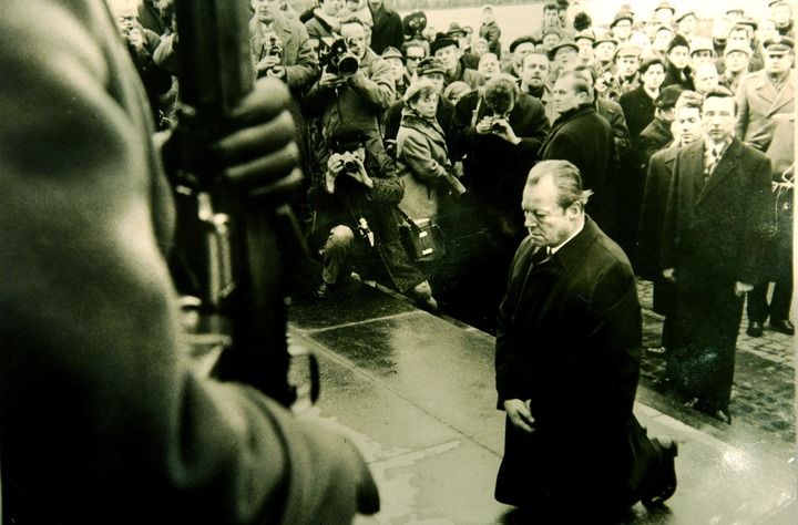 1970年12月7日,聯(lián)邦德國總理勃蘭特在波蘭首都華沙猶太人殉難紀(jì)念碑前下跪。新華社發(fā)