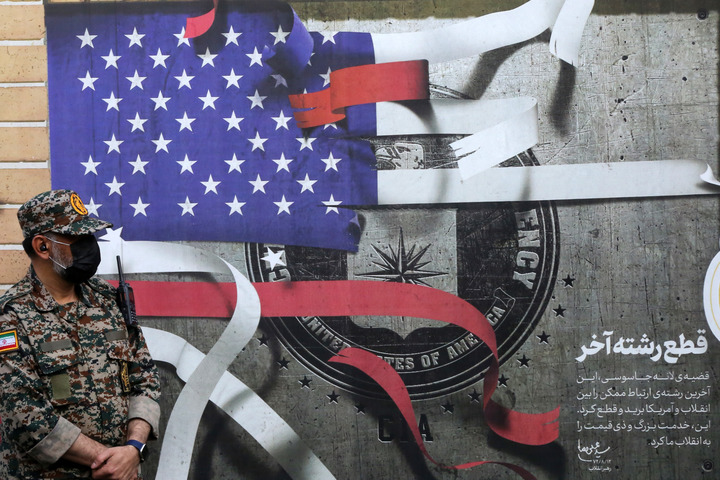 2025年11月4日,在伊朗首都德黑蘭舉行的集會上,安全人員站在反美宣傳畫前。當天,伊朗多地民眾舉行集會,譴責美國霸權(quán)和以色列的侵略行為。新華社發(fā)