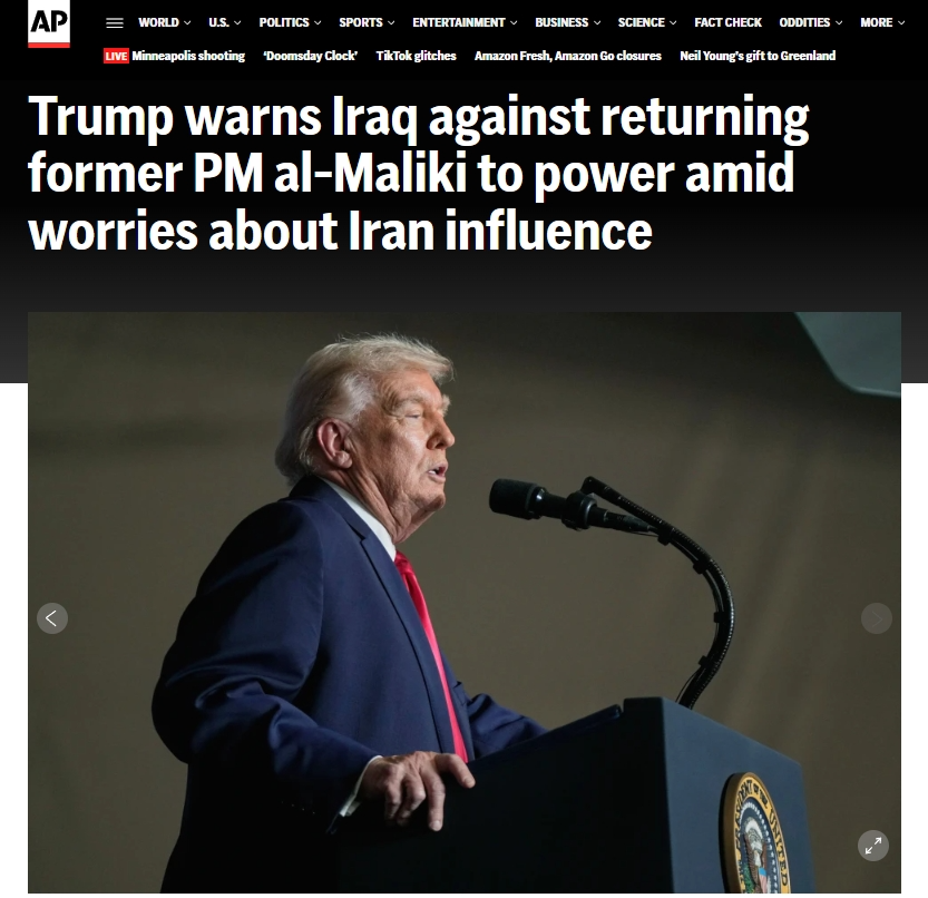 美國總統(tǒng)特朗普當(dāng)?shù)貢r間1月27日在社交媒體發(fā)文稱,如果伊拉克前總理努里·馬利基再度當(dāng)選總理,美國將不再“援助”伊拉克。