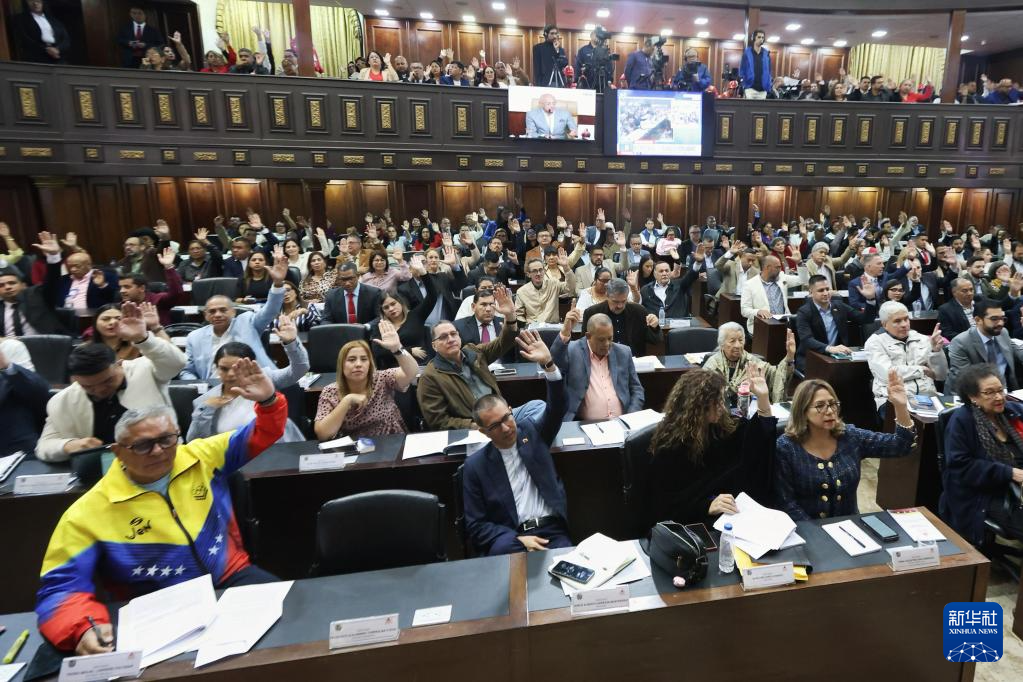 1月29日,在委內(nèi)瑞拉首都加拉加斯,議員們在委內(nèi)瑞拉立法機(jī)構(gòu)全國代表大會例行會議上舉手表決。新華社發(fā)(委內(nèi)瑞拉全國代表大會供圖)