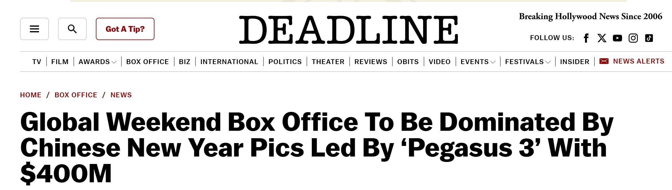 春節(jié)假期,各地觀影需求旺盛,春節(jié)檔票房持續(xù)攀升。美國好萊塢行業(yè)媒體“Deadline”日前的一篇報道預測,由于中國春節(jié)檔大幕的開啟,本周末全球票房最高的電影將會來自中國。