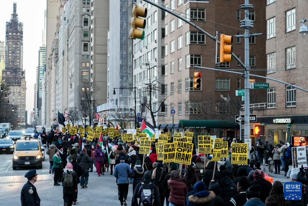 2日傍晚,數(shù)百名抗議者冒著嚴(yán)寒在紐約市哥倫布圓形廣場(chǎng)集會(huì),組織方代表發(fā)表演講,人們手持標(biāo)語(yǔ),大聲呼喊反戰(zhàn)口號(hào),要求“停止針對(duì)伊朗的戰(zhàn)爭(zhēng)”,隨后開始游行示威。