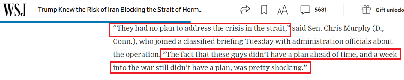 《華爾街日報(bào)》14日的報(bào)道指出,當(dāng)前霍爾木茲海峽通行受阻及由此引發(fā)的經(jīng)濟(jì)動蕩,反映出美國政府在發(fā)動軍事打擊時缺乏規(guī)劃與深思熟慮。