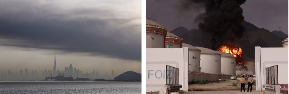 左圖:當(dāng)?shù)貢r間13日,迪拜上空冒起濃煙 右圖:阿聯(lián)酋富查伊拉一處石油工業(yè)區(qū)14日遭受襲擊發(fā)生火災(zāi) 圖源:法新社、路透社