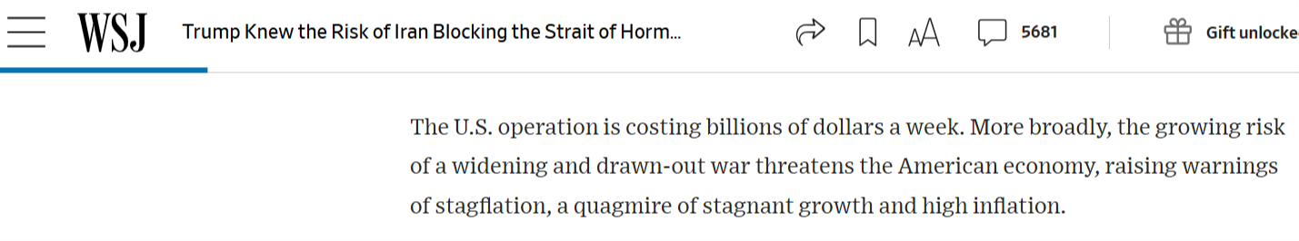 盟友之外,美國民眾也在為這場軍事行動“埋單”。《華爾街日報(bào)》的報(bào)道稱,美國國務(wù)院直到戰(zhàn)爭開始后才敦促美國公民離開該地區(qū)國家或撤離部分大使館。而當(dāng)時,商業(yè)空域已關(guān)閉,數(shù)萬美國人滯留中東,美國的外交官們在部分大使館也處于危險(xiǎn)之中;此外,美國此次軍事行動每周耗資數(shù)十億美元。戰(zhàn)爭不斷擴(kuò)大且長期延宕的風(fēng)險(xiǎn)日益加劇,正威脅著美國經(jīng)濟(jì),甚至引發(fā)“滯脹”風(fēng)險(xiǎn)。