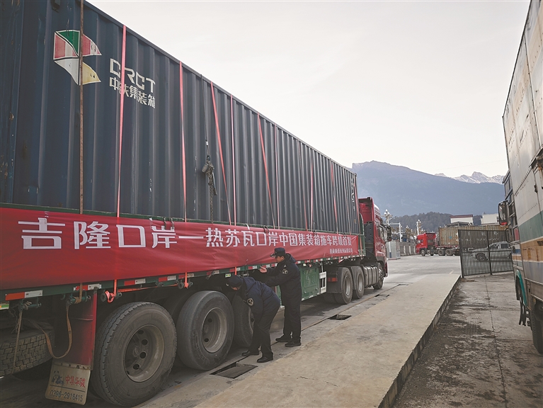 長(zhǎng)期以來,中尼跨境貨物運(yùn)輸主要依賴尼泊爾貨柜車承運(yùn),貨物在口岸需進(jìn)行倒裝、換裝等操作,不僅影響效率,也增加貨損風(fēng)險(xiǎn)。為推動(dòng)跨境物流模式創(chuàng)新,吉隆海關(guān)主動(dòng)對(duì)接地方政府與企業(yè),提供全程政策指導(dǎo),并依托“智慧鷹眼”,實(shí)時(shí)監(jiān)測(cè)物流運(yùn)輸狀態(tài),延伸監(jiān)管鏈條。同時(shí),通過深化“提前申報(bào)”“即到即驗(yàn)即放”“無紙化通關(guān)”等便利措施,壓縮口岸通關(guān)時(shí)間超50%,企業(yè)物流成本顯著降低。