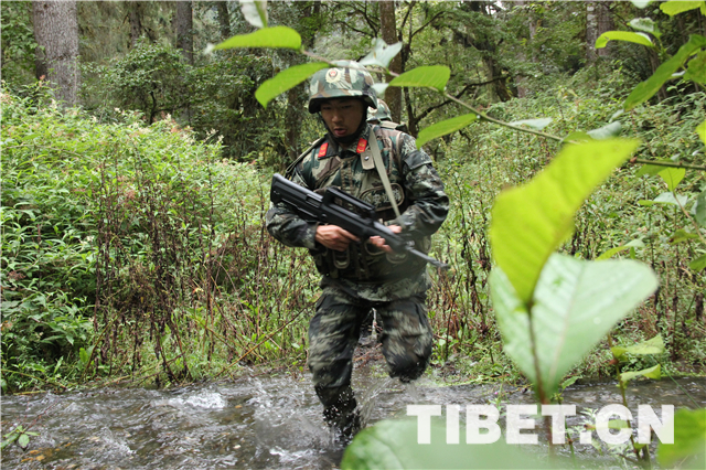 圖為邊防戰(zhàn)士穿越密林中的溪流