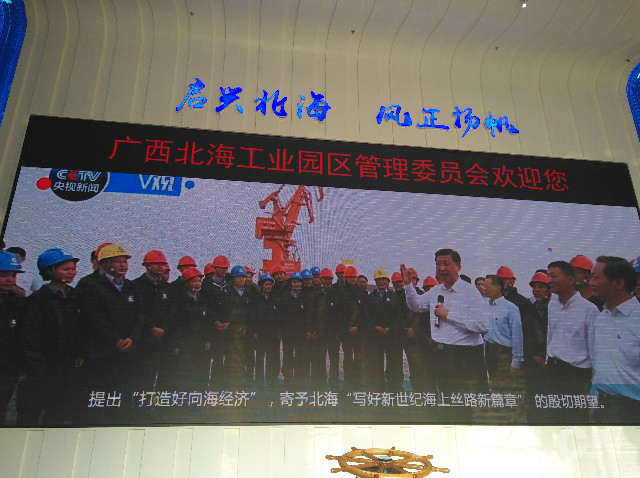 圖為北海工業(yè)園區(qū),正播放習(xí)近平總書記考察時的視頻。攝影:孫健