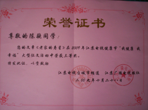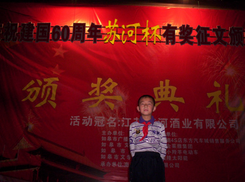 2009年9月19日下午,孩子去如皋電視臺(tái)演播大廳,參加了市廣電局、文化局、教育局、市文聯(lián)等四家單位聯(lián)合舉辦的“蘇河杯”征文頒獎(jiǎng)儀式,頒獎(jiǎng)儀式在隨后的專題片中全程播出。