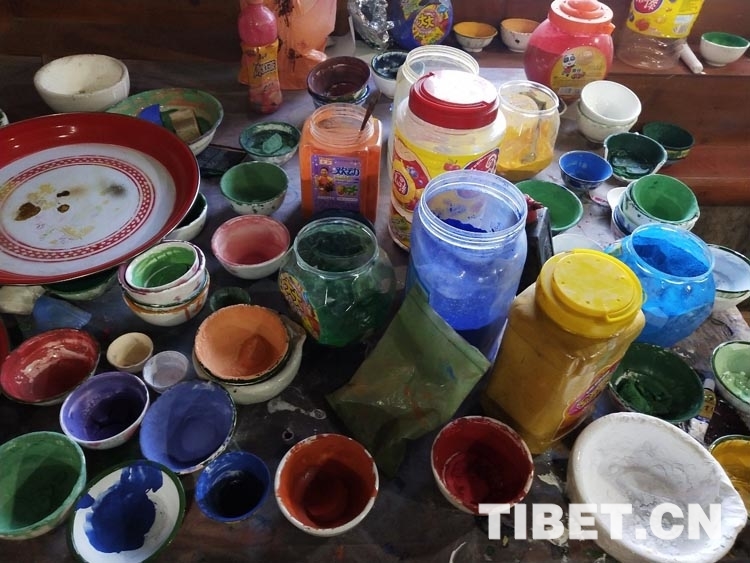 中國西藏網(wǎng)訊 11月20日一大早,記者從康定城出發(fā),經(jīng)過200多公里的長途跋涉,來到爐霍縣朗卡杰唐卡藝術(shù)基地。走進基地二樓畫室,里面擱置著大小不一的唐卡,一張方桌上整齊地擺放著盛滿各類色彩的礦物顏料,60歲的澤仁達吉老師與10余名學(xué)生正在聚精會神地進行唐卡繪畫。