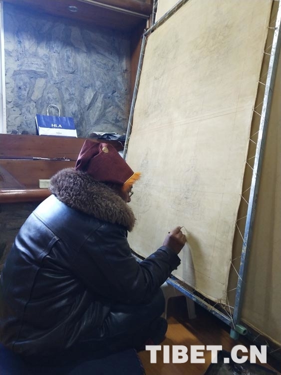 圖為郎卡杰唐卡協(xié)會的畫師正在認真繪制唐卡