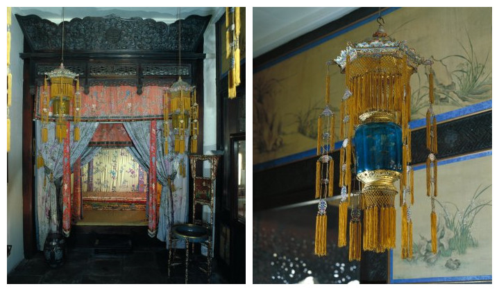 圖中左為寢室內(nèi)的錦繡鋪床,右為寢室內(nèi)懸掛的宮燈。圖片來源:故宮博物院官網(wǎng)