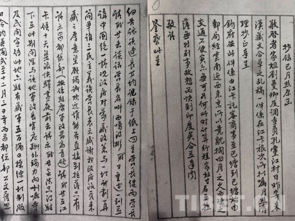 1929年(民國十八年)8月1日,劉曼卿一行從上海出發(fā),開始為期近一年的西藏之行。行至芒康時(shí),劉曼卿寄給其妹劉曼云(藏文名為:巴月照)一封漢藏文合并的字跡潦草的文稿,并囑咐她整理抄正后轉(zhuǎn)呈國民政府。此封文稿是劉曼卿行至江卡,就是現(xiàn)在的芒康地方時(shí)擬就的,記述了劉曼卿一行到該地后沿途的經(jīng)過情形。因?yàn)楫?dāng)時(shí)的通信很不便利,劉曼卿托芒康的客商將這封信帶到巴塘,又由巴塘的郵局經(jīng)云南發(fā)往南京。輾轉(zhuǎn)四個(gè)月之久,這封信才寄到劉曼云手中,而此時(shí)已是民國十九年的3月份了。