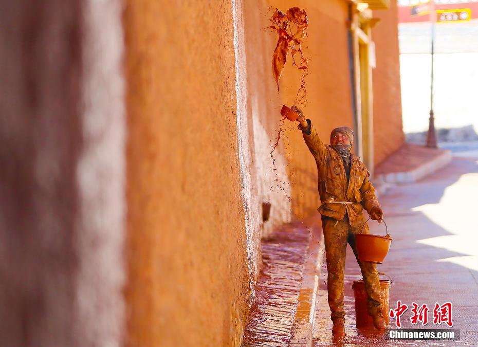 拉卜楞寺用傳統(tǒng)潑灑法為寺院墻壁“美顏”