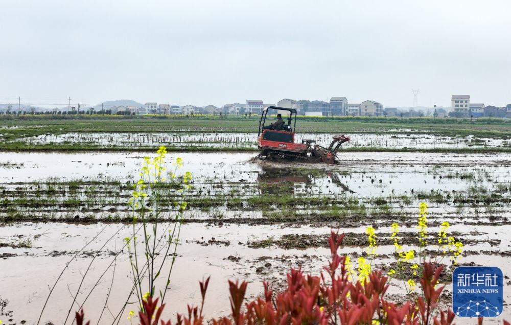 3月17日,在湖南省衡陽市衡陽縣西渡鎮(zhèn)青里村,村民駕駛農(nóng)機翻耕農(nóng)田(無人機照片)。新華社發(fā)(周秀魚春攝)