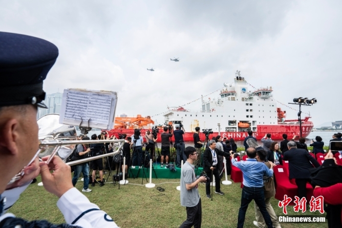 這次,香港更是以“海陸空”上陣歡迎“雪龍2”號到訪香港。在“雪龍2”號不遠處,兩艘拖船和一艘消防船在碼頭附近對射水柱,形成水拱門。香港飛行服務(wù)隊的直升機飛過維多利亞港上空示意致敬,香港警察銀樂隊在現(xiàn)場奏樂,九龍巴士車隊貼上歡迎“雪龍2”號標志,還有舞獅隊歡迎“雪龍2”號來到香港。