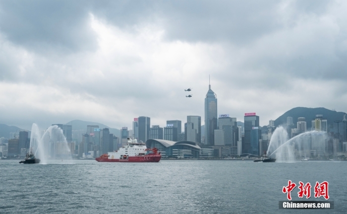 4月8日上午,中國首艘自主建造的極地科學(xué)考察破冰船“雪龍2”號抵達香港。圖為“雪龍2”號通過維多利亞港時收到海事傳統(tǒng)噴水歡迎。中新社記者 侯宇 攝