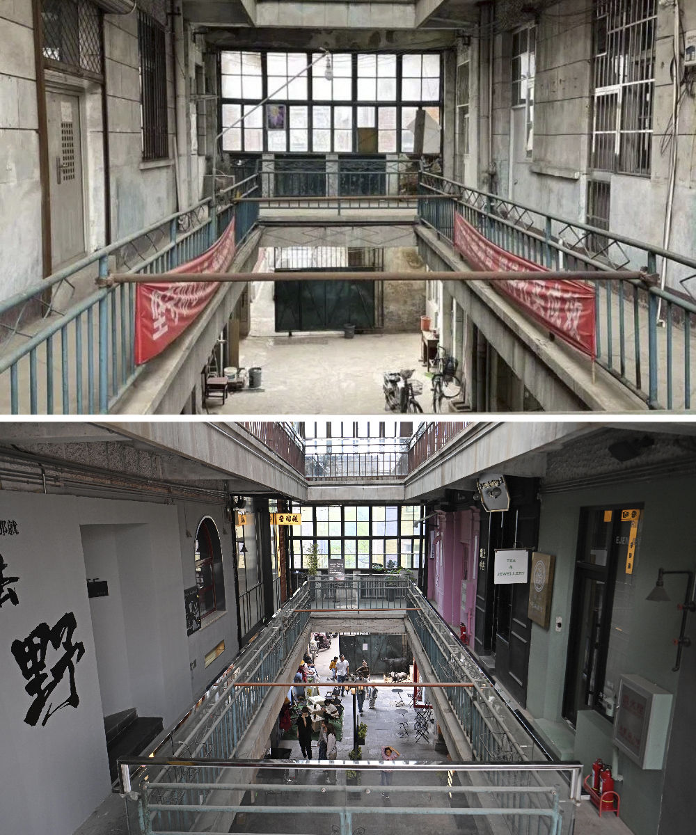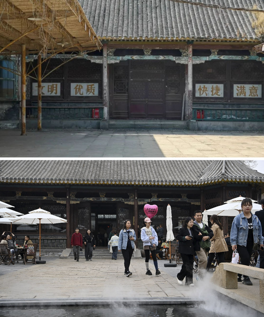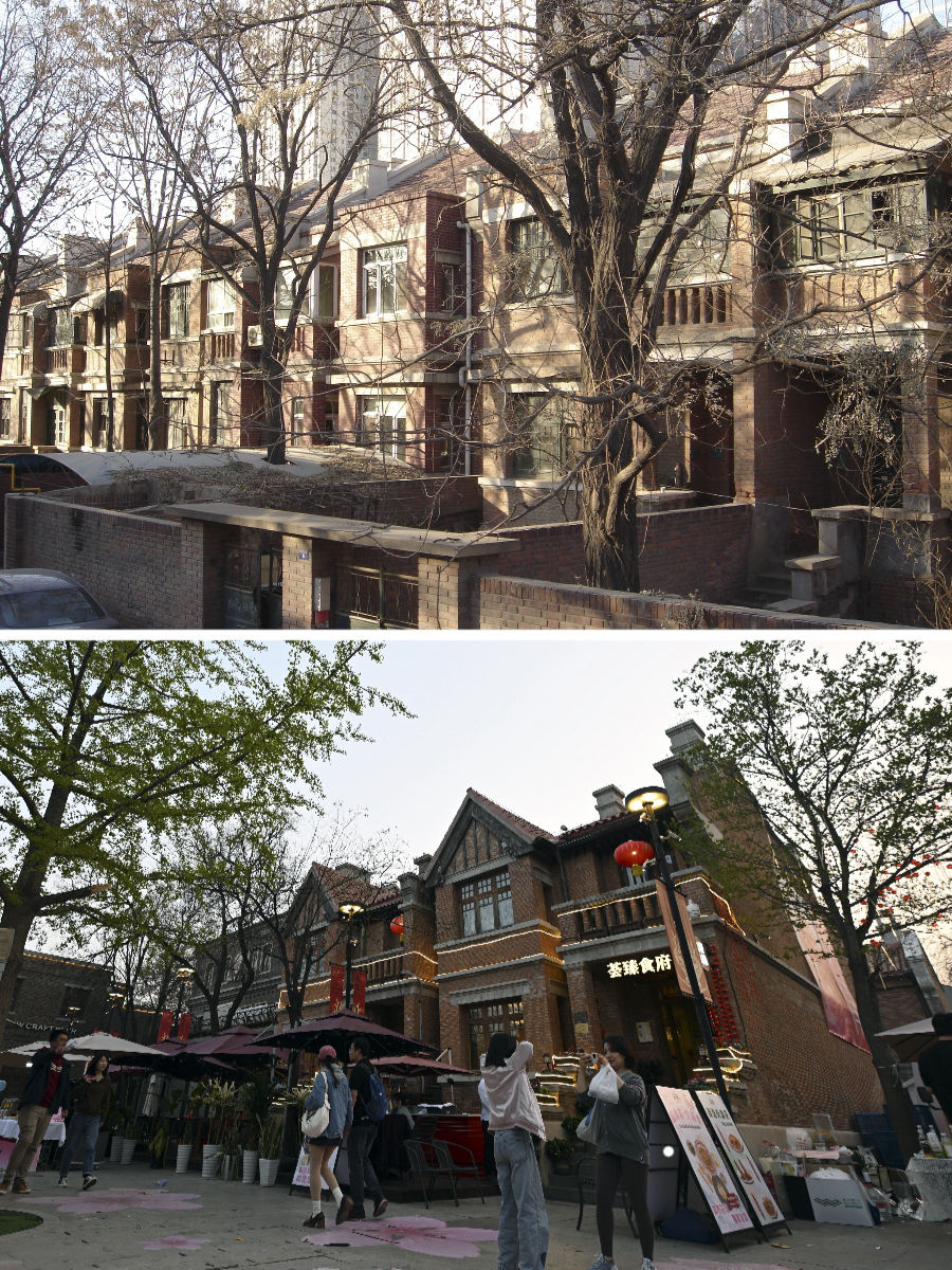 拼版照片:上圖是改造前的先農(nóng)大院(資料照片)。下圖是游客在位于五大道的先農(nóng)大院內(nèi)游覽(4月6日攝)。始建于1925年的先農(nóng)大院是五大道建成最早的建筑群之一,融合了英式聯(lián)排住宅、英式獨棟別墅等多種特色的建筑風格。歲月變遷,這些建筑一度損壞嚴重,配套設施老化。2006年起,天津啟動先農(nóng)大院整理項目,對街區(qū)居民進行了騰遷,對建筑進行了加固修繕,恢復了街區(qū)的歷史原貌,引進了餐飲、文化展示、辦公等業(yè)態(tài),使這里形成了環(huán)境優(yōu)雅的公共藝術(shù)和展示建筑遺產(chǎn)的城市新空間。
