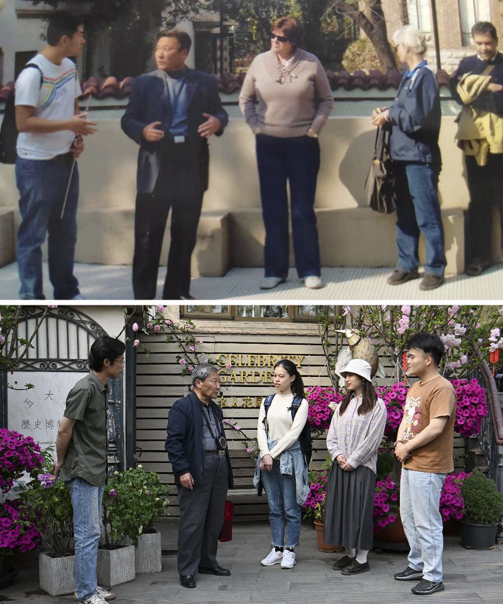 拼版照片:上圖是2011年金彭育(左二)在五大道和平賓館義務為外國游客講解;下圖是金彭育(左二)在五大道上為游客義務講解(4月13日攝)。