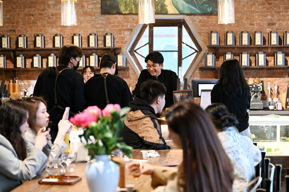 在天津市和平區(qū)五大道,一家新開業(yè)的茶飲店內(nèi)顧客絡繹不絕(4月10日攝)。