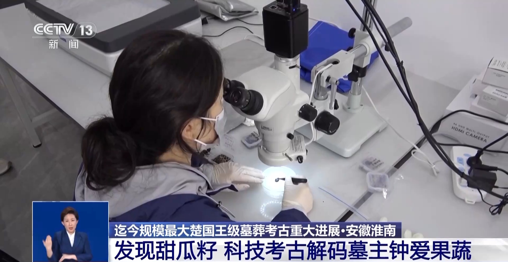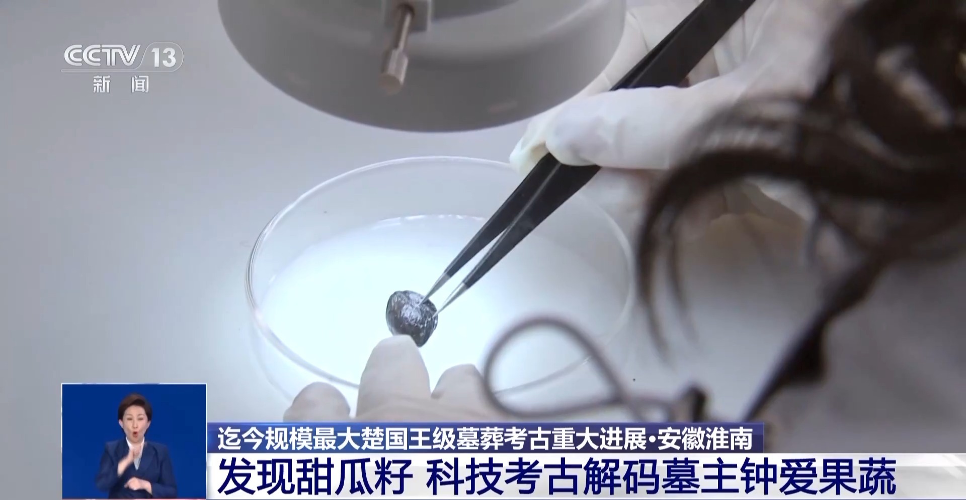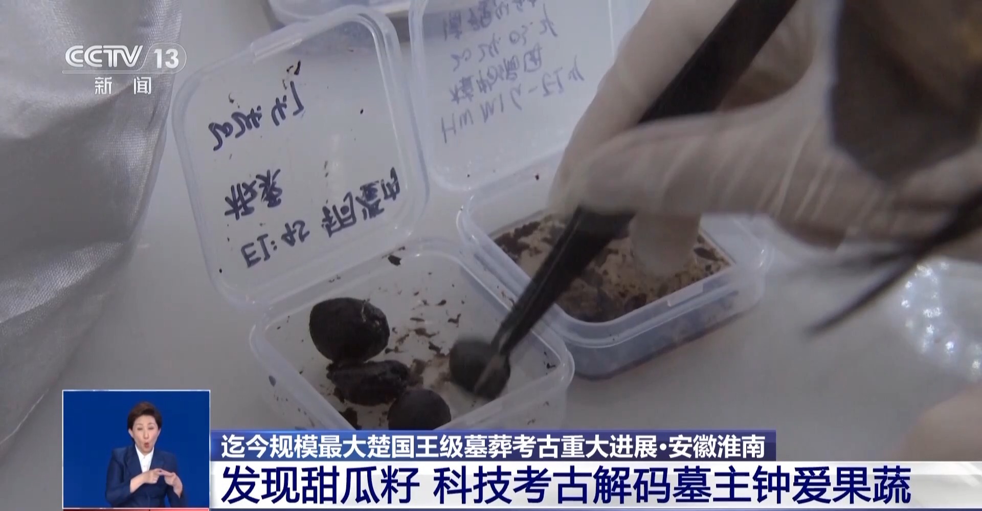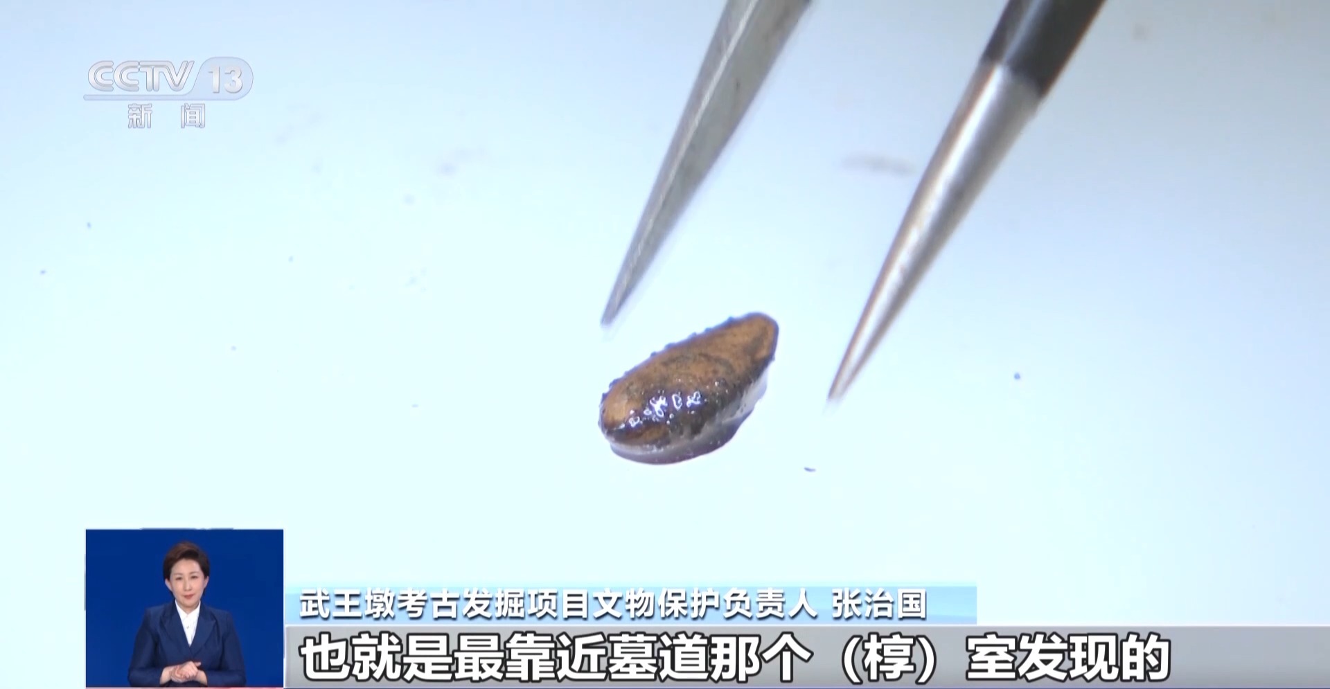 武王墩考古發(fā)掘項目文物保護負責人 張治國:發(fā)現(xiàn)大部分的這個里面都是一些樹葉,然后還有果核,可能還有一些草編的痕跡,目前初步鑒定出來的有甜瓜籽,然后還有一些梅核。