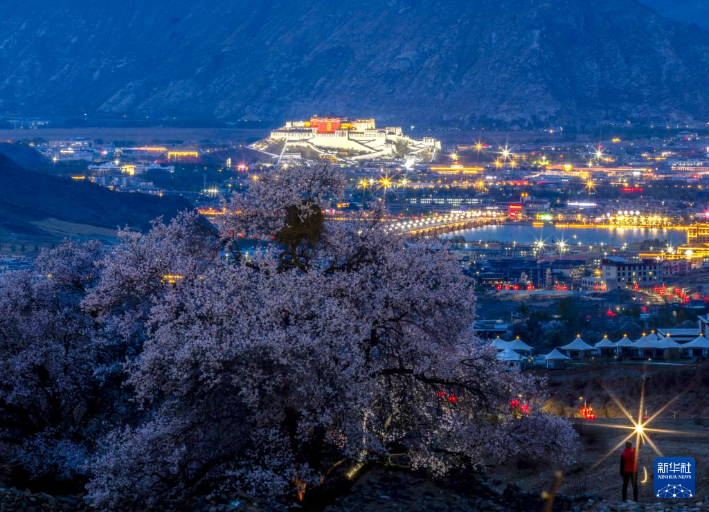 ??夜色中桃花映襯著布達(dá)拉宮(4月16日攝)。新華社記者 姜帆 攝