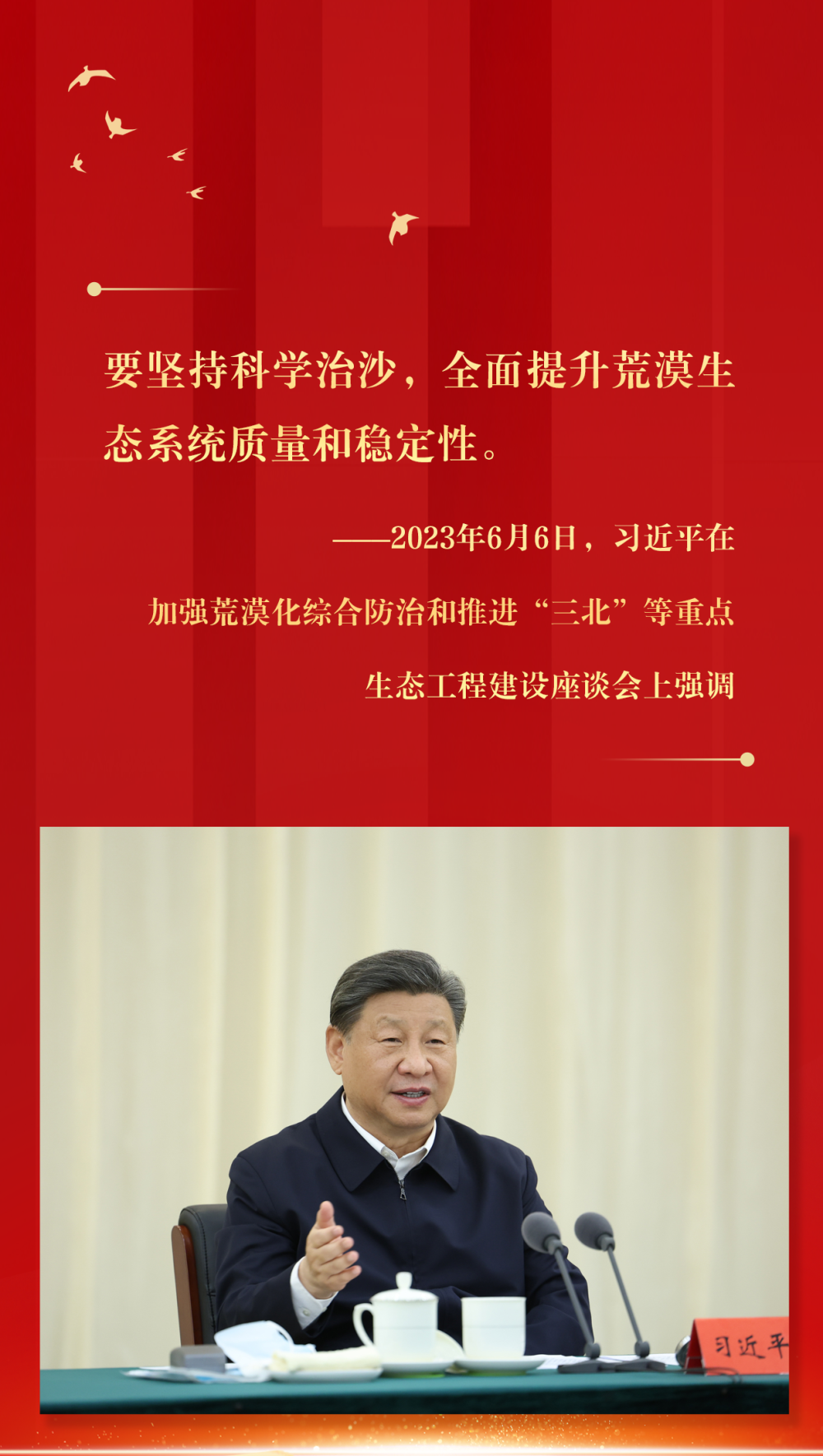 2023年6月5日至6日,習(xí)近平在內(nèi)蒙古巴彥淖爾考察,并主持召開加強(qiáng)荒漠化綜合防治和推進(jìn)“三北”等重點(diǎn)生態(tài)工程建設(shè)座談會(huì)。這是6日上午,習(xí)近平在臨河區(qū)國營新華林場(chǎng)考察。