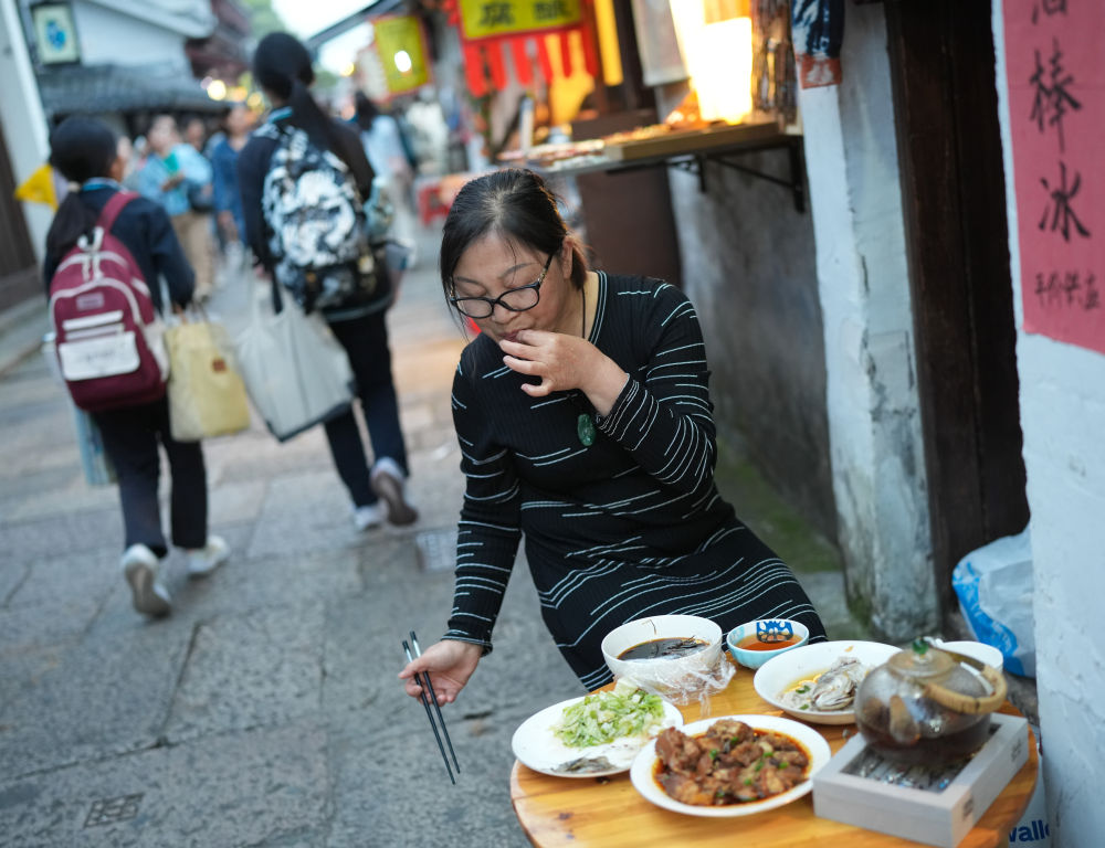 浙江紹興倉(cāng)橋直街,人來(lái)客往。傍晚,居民童秀娟把小飯桌搬到家門口,倚街而坐,拈起一只醉蝦嘬起來(lái)。尋常煙火味,彌散開來(lái)。