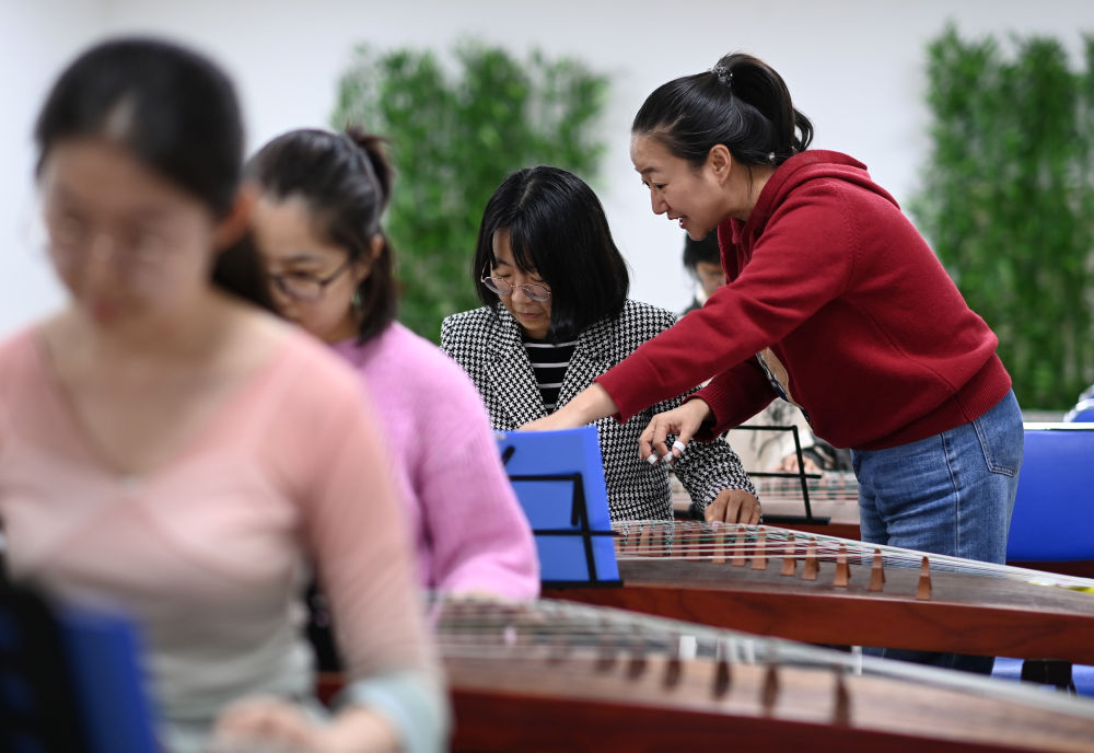 ↑4月23日,在天津青年宮,青年夜校教師劉冰指導學員學習古箏。