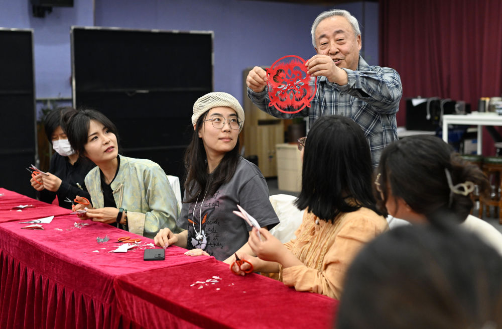 ↑4月24日,在天津市河西區(qū)春秋文化藝術中心,河西區(qū)青年夜校教師在剪紙體驗課上展示學員作品。
