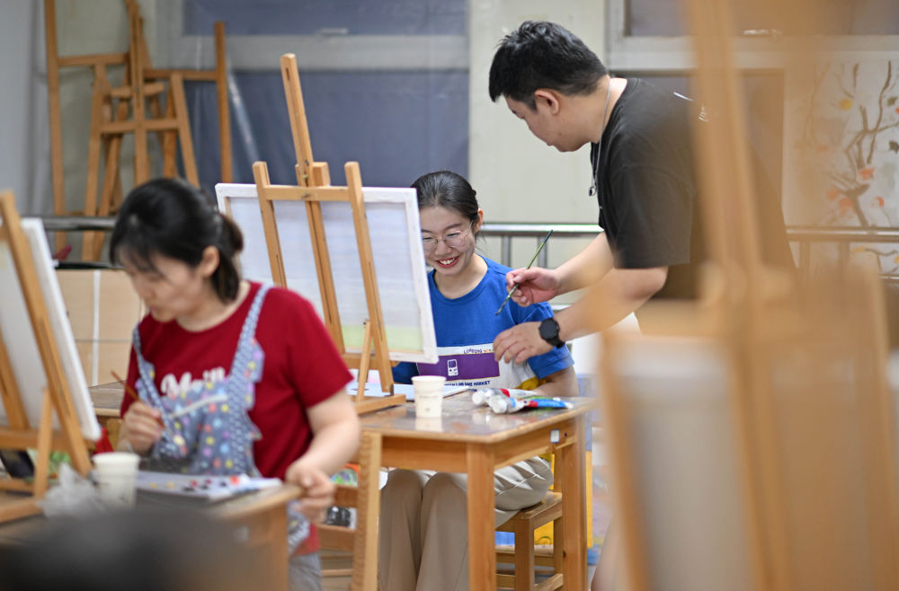 ↑4月26日,在天津青年宮,青年夜校教師陸圣指導學員呂昕蕾學習油畫。
