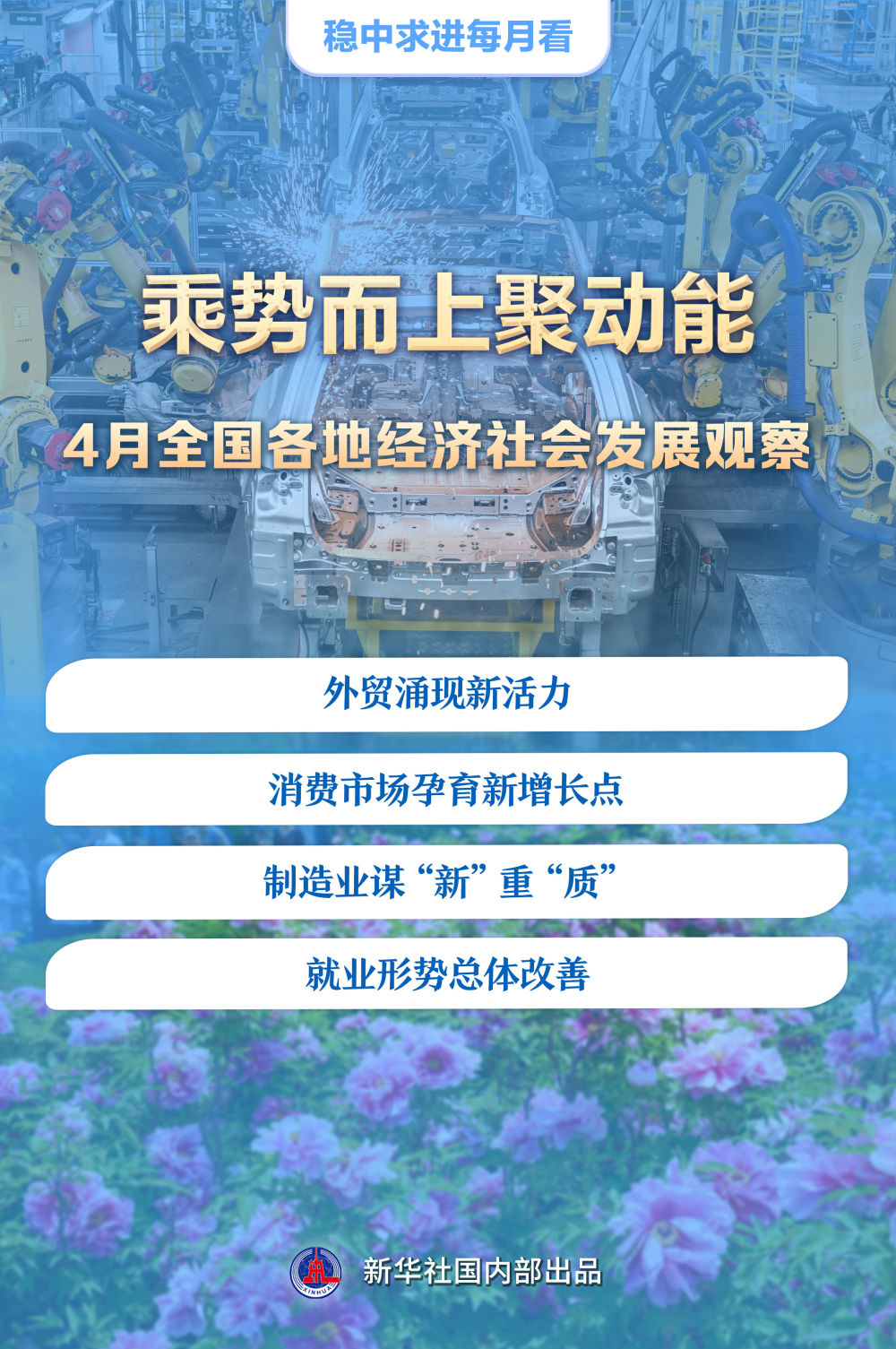 春意盎然育生機(jī)。一季度經(jīng)濟(jì)數(shù)據(jù)出爐釋放積極信號,消費(fèi)市場亮點紛呈,經(jīng)濟(jì)社會發(fā)展對就業(yè)的帶動效應(yīng)逐步顯現(xiàn)……今年4月,全國各地真抓實干,乘勢而上,進(jìn)一步鞏固和增強(qiáng)經(jīng)濟(jì)回升向好態(tài)勢。