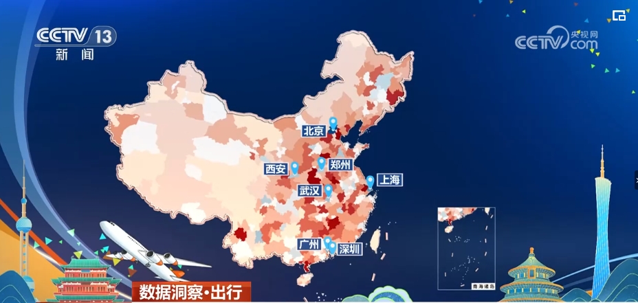 這是一張根據(jù)12306火車(chē)票預(yù)售數(shù)據(jù)繪制的熱力圖,紅色越深代表在5月1日乘火車(chē)凈流入到這個(gè)城市的人越多,藍(lán)色越深則表示凈流出這里的人越多。可以看到,北上廣深、武漢、鄭州、西安等中心城市是凈流出人數(shù)較多的城市。