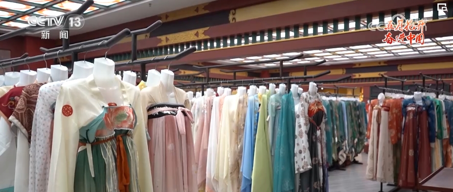 看起來對漢服造型頗有研究的胡芯銀今年只有24歲。胡芯銀介紹,也就是在這幾年,隨著大家對傳統(tǒng)文化的喜愛,西安的漢服館如雨后春筍般涌現(xiàn)。感受到“漢服熱”的胡芯銀在2022年初,辭去了原先婚禮跟妝的工作,應(yīng)聘到了這家位于長安十二時辰主題街區(qū)附近的漢服館,擔任漢服造型師。