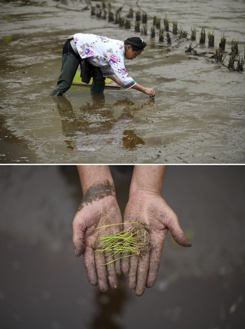 在廣西柳州市融水苗族自治縣桿洞鄉(xiāng)黨鳩村,51歲的村民韋妹麗在插秧(4月11日攝)。韋妹麗家的兩畝多田,養(yǎng)育她一家5口。