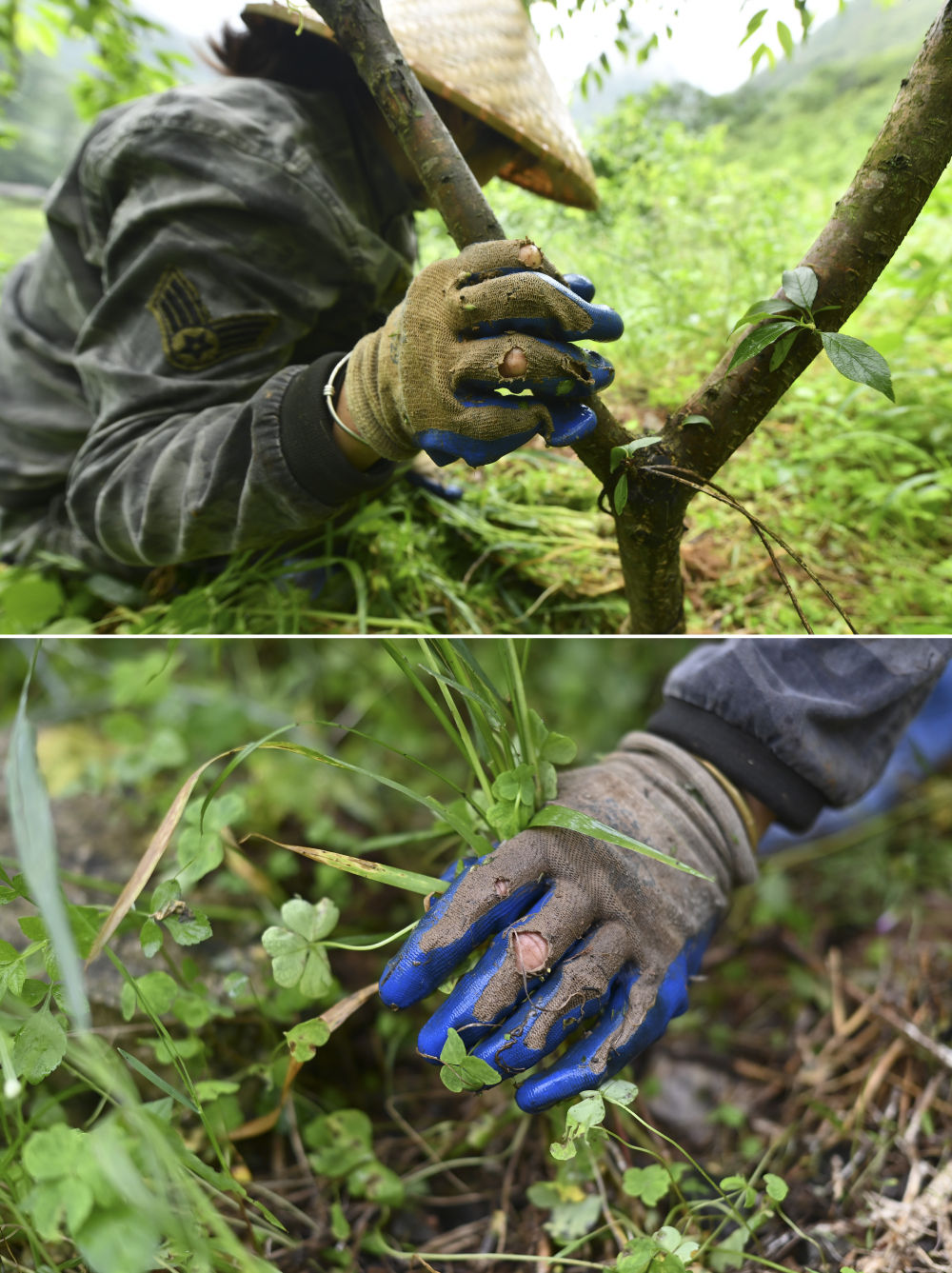 在廣西柳州市融安縣東起鄉(xiāng)銅板屯,61歲的龍飛任在山上為果樹除草(4月23日攝)。10多年來(lái),龍飛任返鄉(xiāng)創(chuàng)業(yè),和村民們一起發(fā)展水果種植和觀光旅游。