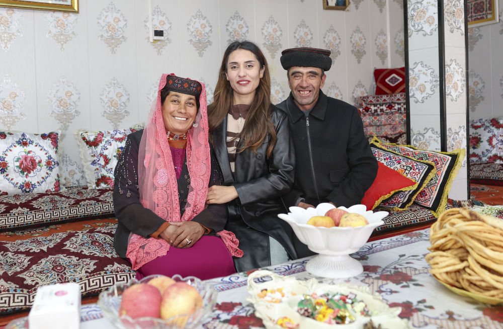 回家探親時(shí),艾爾開(kāi)牙·多力開(kāi)(中)和父母在家中合影(2024年3月23日攝)。