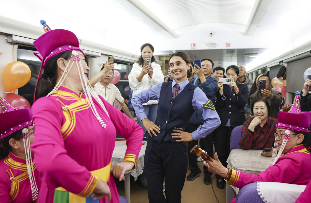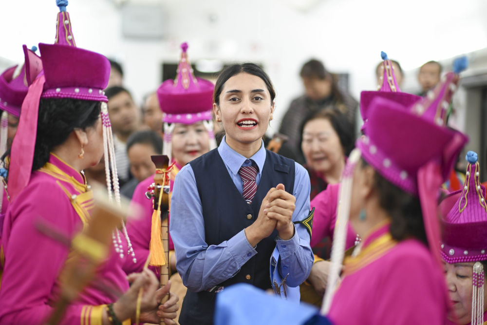 在由喀什開(kāi)往成都西的列車(chē)上,艾爾開(kāi)牙·多力開(kāi)與民間藝人一起為乘客跳舞(4月19日攝)。