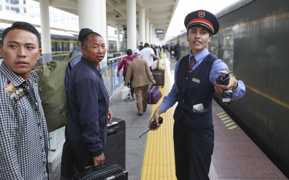 在成都西站,艾爾開(kāi)牙·多力開(kāi)(右)引導(dǎo)乘客登上由成都西開(kāi)往喀什的列車(chē)(4月20日攝)。
