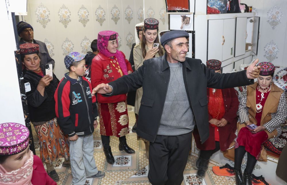 在位于新疆塔什庫(kù)爾干塔吉克自治縣瓦恰鄉(xiāng)夏布孜喀拉村的家中,父親多力開(kāi)·百爾飛克跳起舞蹈慶祝女兒回家探親(2024年3月23日攝)。