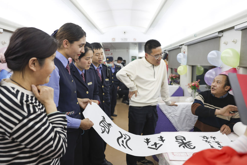 一名來(lái)自四川樂(lè)山的雕刻師(右一)向艾爾開(kāi)牙·多力開(kāi)(左二)帶領(lǐng)的乘組贈(zèng)送書(shū)法作品“真水無(wú)香”,稱(chēng)贊乘務(wù)員們的辛勤付出(4月19日攝)。