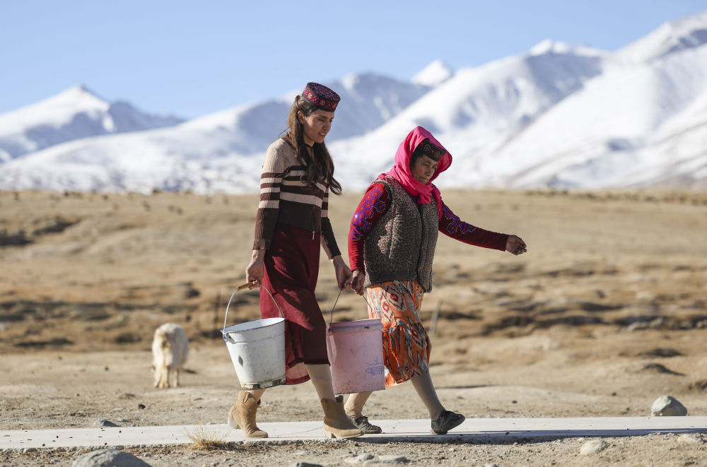 在新疆塔什庫(kù)爾干塔吉克自治縣瓦恰鄉(xiāng)夏布孜喀拉村,艾爾開(kāi)牙·多力開(kāi)(左)幫母親拎水(2024年3月23日攝)。