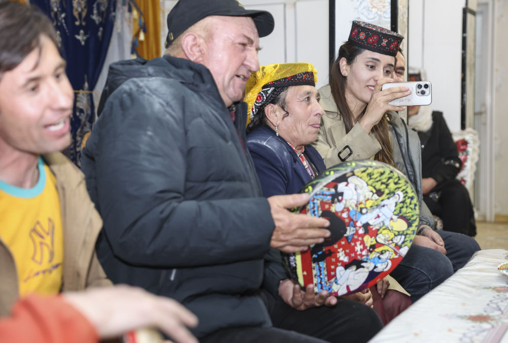 在位于新疆塔什庫(kù)爾干塔吉克自治縣瓦恰鄉(xiāng)夏布孜喀拉村的家中,艾爾開(kāi)牙·多力開(kāi)用手機(jī)記錄歡聚時(shí)刻(2024年3月23日攝)。