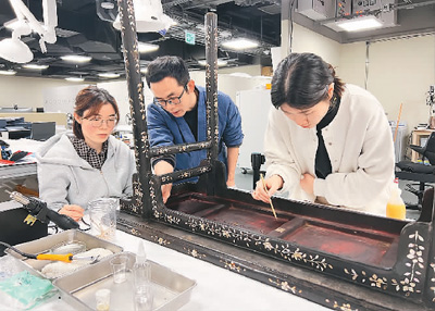 在修復漆器的基礎(chǔ)上疊加螺片的修復與鑲嵌,修復難度又提高了。梁嘉放說,漆器修復的實際操作很復雜,原文物用漆的成分、刷漆方法、天氣情況對漆的影響等因素,都是儀器無法探及的。