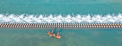 湖南省永州市東安縣白牙市鎮(zhèn)鐵爐村村干部(左)與志愿者在湘江一級(jí)支流紫水河上打撈漂浮物。 蔡小平攝(人民視覺(jué))