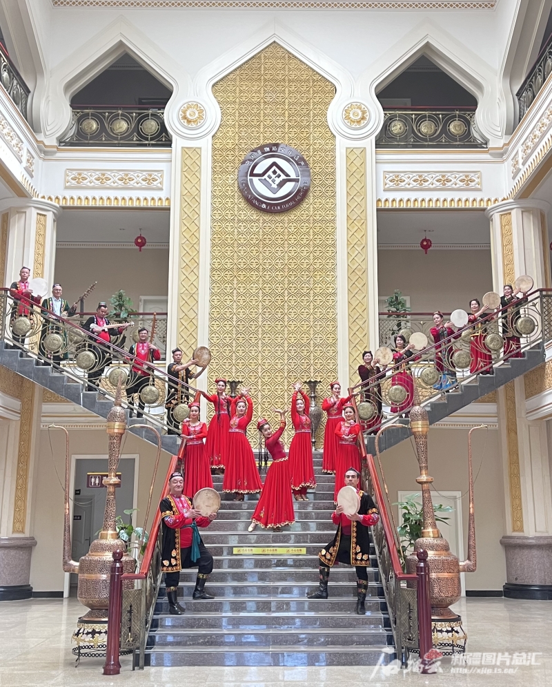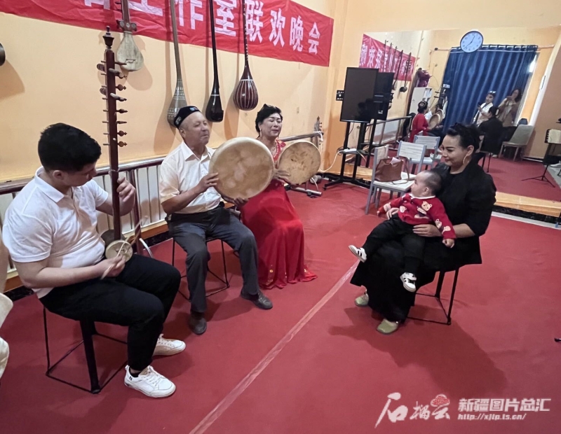 在哈密市非物質文化遺產(chǎn)保護中心,回城鄉(xiāng)的傳承人們和當?shù)匮輪T進行哈密木卡姆表演。石榴云/新疆日報記者 王晶晶攝