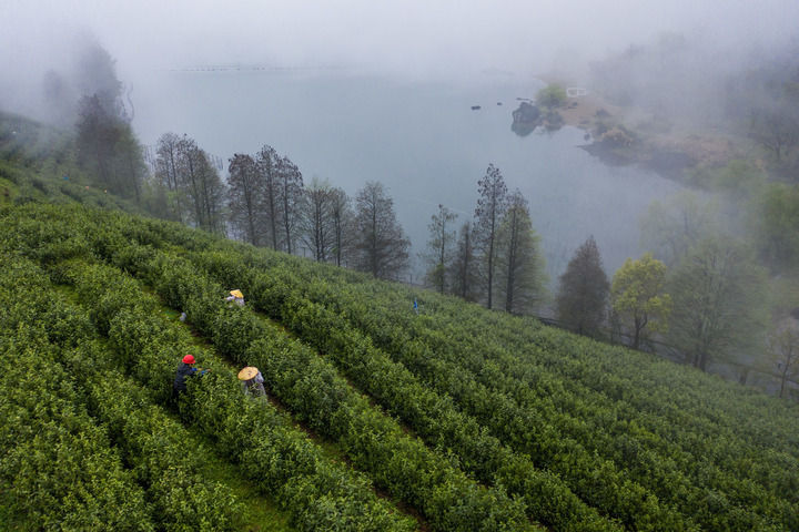 2024年4月7日,在位于浙江省金華市金華山鹿田村的婺州舉巖茶基地,茶農(nóng)在采摘舉巖茶鮮葉,發(fā)展特色茶產(chǎn)業(yè)是推動當(dāng)?shù)匕傩展哺坏闹匾緩街唬o人機(jī)照片)。新華社記者 徐昱 攝
