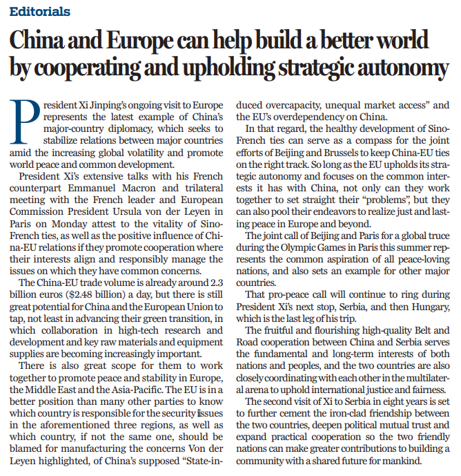 中國領(lǐng)導人此次歐洲之行旨在全球局勢日益動蕩之際穩(wěn)定大國關(guān)系和中歐關(guān)系,促進世界和平與共同發(fā)展。在促進歐洲、中東和亞太地區(qū)的和平與穩(wěn)定方面,中歐雙方有很大的合作空間。只要歐盟堅持戰(zhàn)略自主,著眼于中歐共同利益,雙方不僅可以攜手合作,還可以為實現(xiàn)歐洲和歐洲以外地區(qū)公正與持久的和平共同努力,為世界和平與發(fā)展以及人類的進步作出新的貢獻。