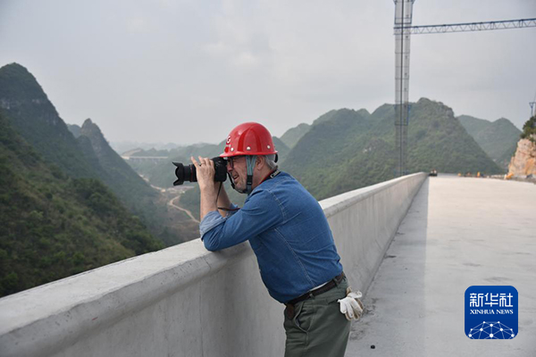 法國攝影師格雷瓜爾·戴高樂在花江峽谷大橋施工現(xiàn)場拍攝(4月27日攝)。新華社記者 駱飛 攝